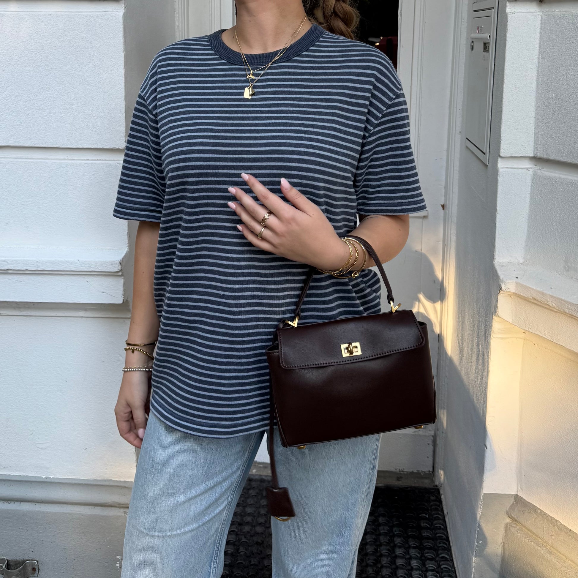 „Emily“ in small is handcrafted from ultra-soft, high-quality smooth calf leather. It features side buttons to expand its capacity and is perfect for everyday use, work, or university, adding a unique and rock-inspired touch to your outfit. Inside, it’s divided into two compartments with one pocket. Adjustable genuine leather shoulder strap, antique gold hardware.