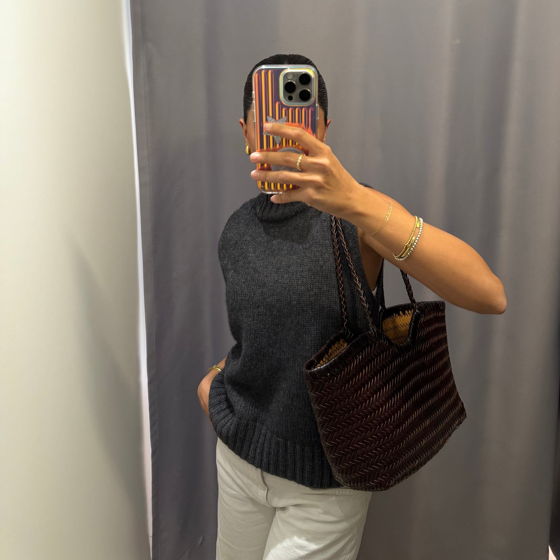 Two woven handles allow for carrying over the shoulder or by hand. Generous interior space – perfect for everyday use, work, or university. Includes a removable fabric pouch.